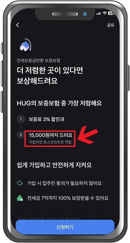토스에서 전세보증보험을 가입하면 무려 15,000원을 받을 수 있습니다!