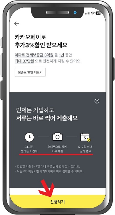 이렇게 카카오뱅크에서 카카오페이로 연결하여 전세보증보험 신청을 하셔도 되고, 앞에서 말씀드린 카카오페이 앱에서 직접 신청하셔도 됩니다!