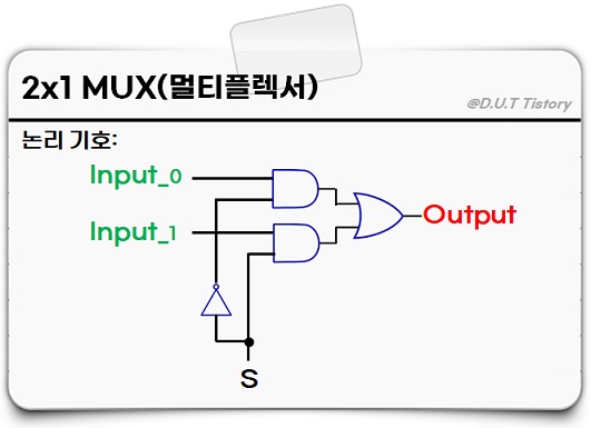 2x1 멀티플렉서(MUX)에서 AND 게이트 2개와 NOT 게이트 1개가 더 추가됐습니다.