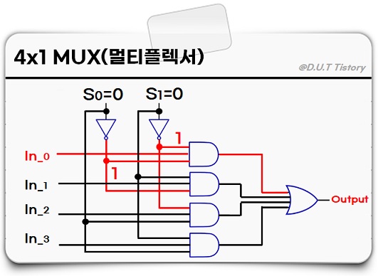 선택선 S0=0, S1=0을 선택하면 위에서 첫 번째 AND 게이트의 2개의 입력이 모두 1이 됩니다.