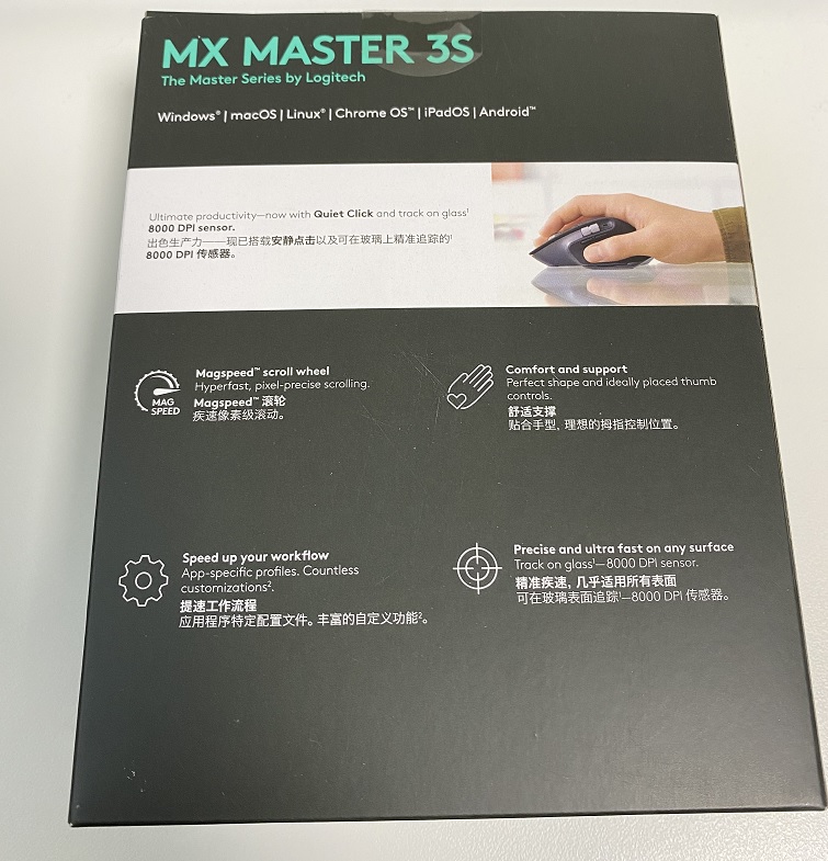 박스 뒷면을 보면 여러 OS를 지원한다고 설명되어 있습니다. 마우스 최대 감도는 8000 DPI입니다.