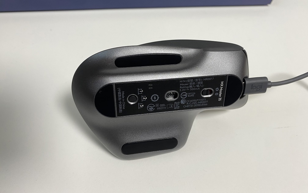 로지텍 MX Master 3S 무선 마우스 아래에 전원 ON, OFF 및 로지텍 FLOW 기술을 활용할 수 있는 1,2,3 표시 LED가 있습니다.